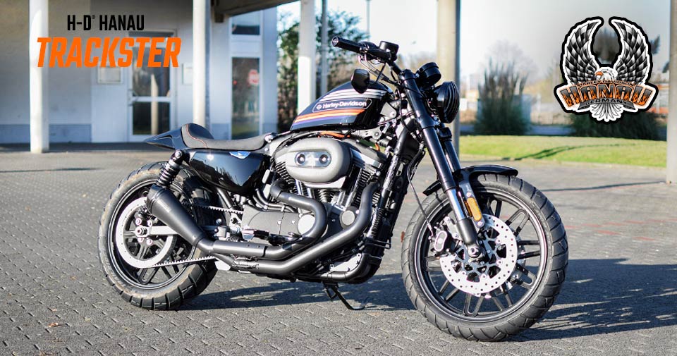 Unser Trackster Custombike auf aufgebaut auf Basis einer Sportster Roadster. Stilistisch zuhause ist das Bike zwischen Straße, Feldweg und irgendwo dazwischen. Ausgestattet u.a. mit grobem Profilreifen, kurzen Heckfender-Sitzbank-Kombi, kleinen Front- und Heckblinkern, einer Custom-Auspuffanlage und Zubehörteile aus dem H-D Zubehör Katalog.